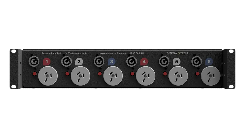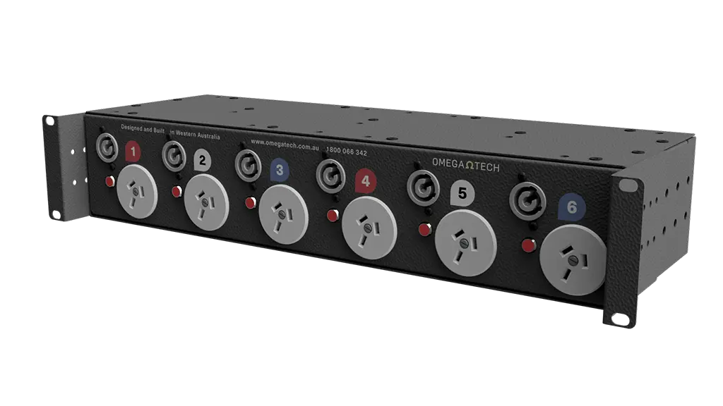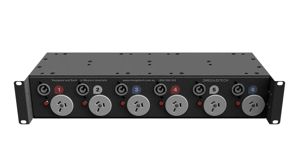 OmegaTech’s range of 6 channel Power Distribution Units (PDU6) is designed for fixed or mobile applications where three phase to single phase socket outlet power distribution is required. The range is built on a 2U 150mm deep 19″ chassis, featuring adjustable rack ears, allowing the units to be front or rear mounted. As well as offering a traditional power distribution in a low profile package, it also offers a unique solution for stage power applications when reverse mounted and paired with our Stage Box Strips. It is also ideally suited for use with data distribution or powered speaker applications where hybrid cables can be deployed to both signal and power without the need for extra patch bays.