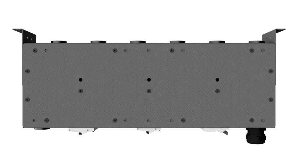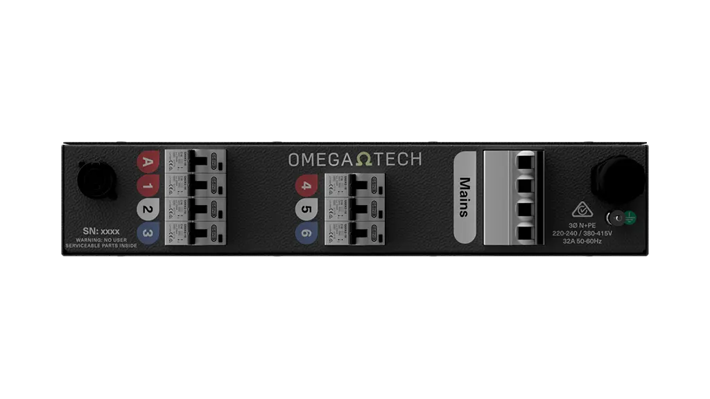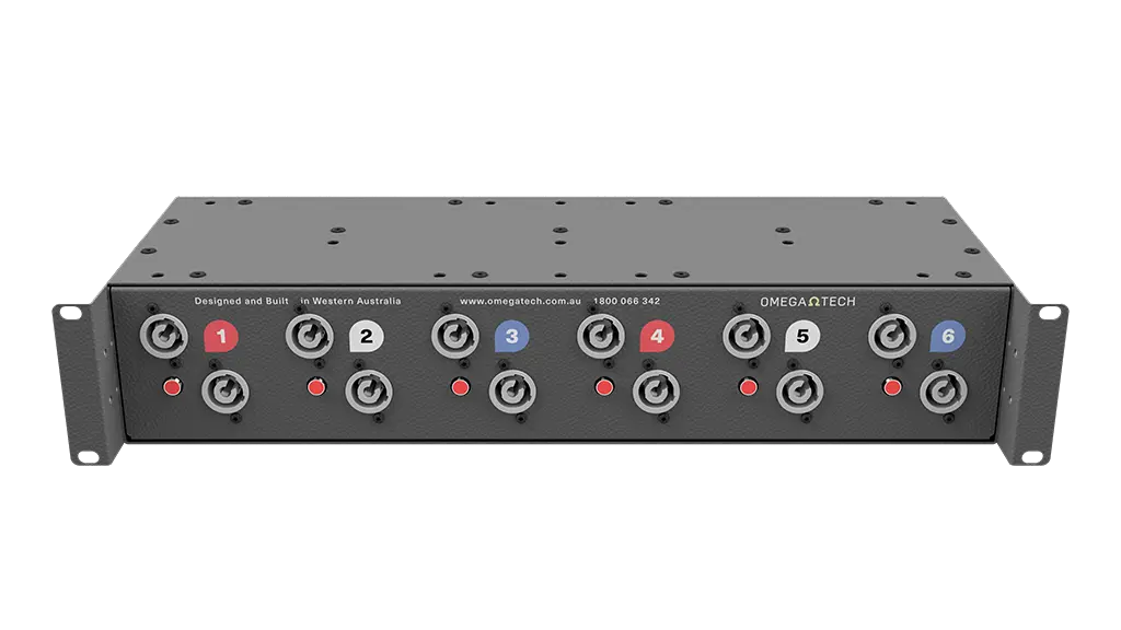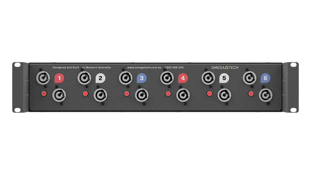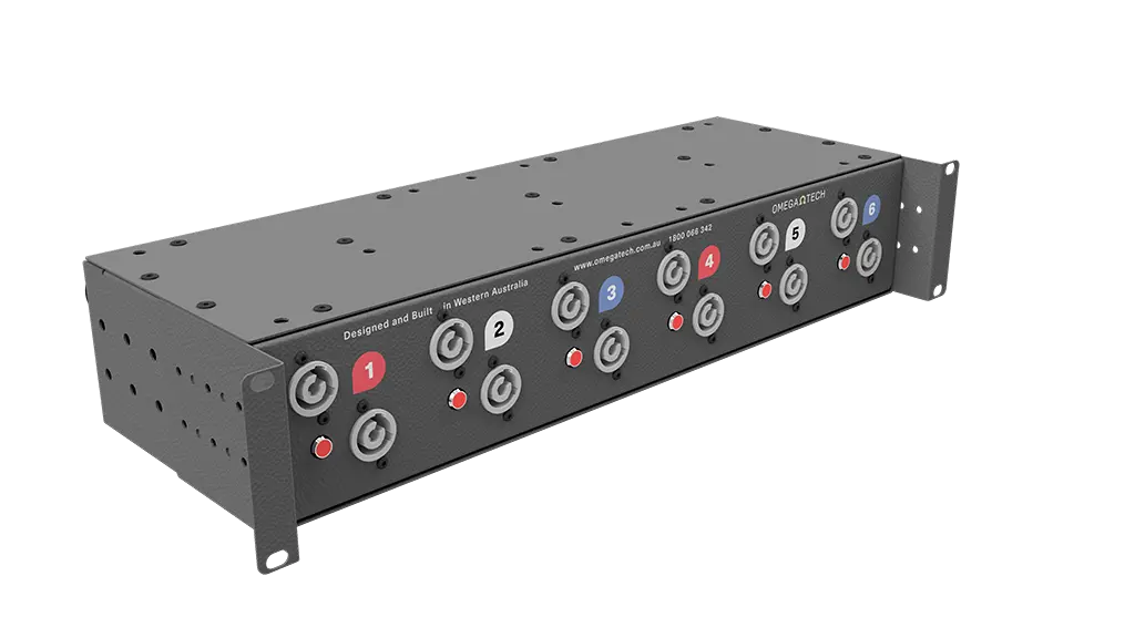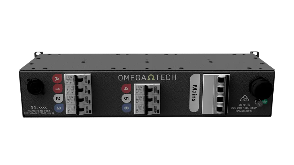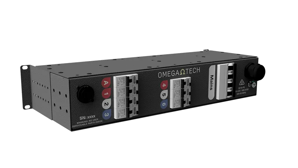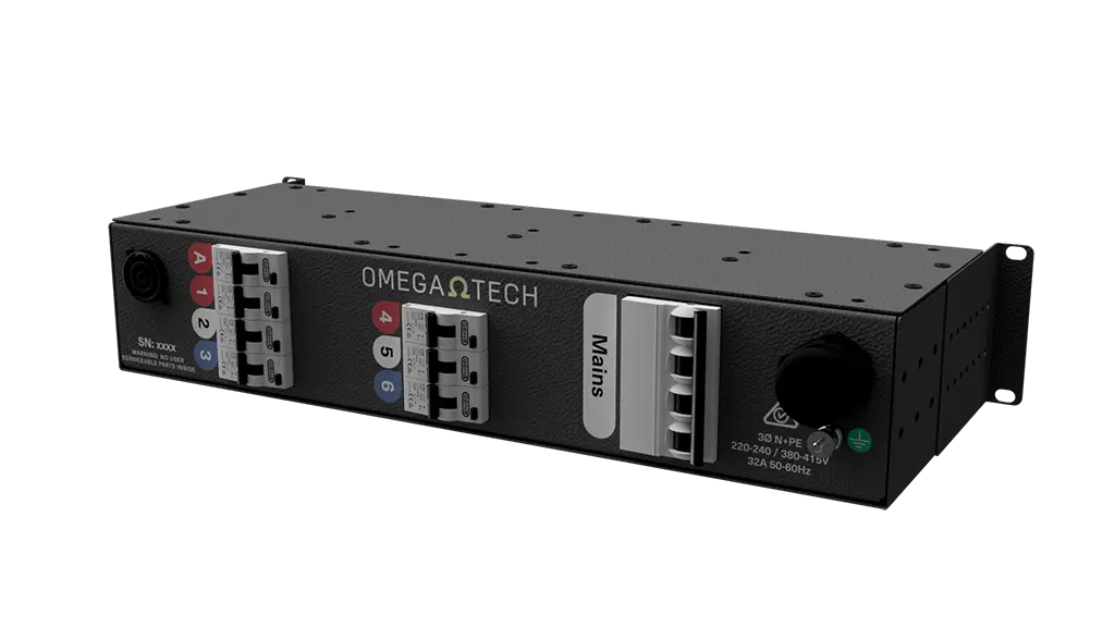 OmegaTech’s range of 6 channel Power Distribution Units (PDU6) is designed for fixed or mobile applications where three phase to single phase socket outlet power distribution is required. The range is built on a 2U 150mm deep 19″ chassis, featuring adjustable rack ears, allowing the units to be front or rear mounted. As well as offering a traditional power distribution in a low profile package, it also offers a unique solution for stage power applications when reverse mounted and paired with our Stage Box Strips. It is also ideally suited for use with data distribution or powered speaker applications where hybrid cables can be deployed to both signal and power without the need for extra patch bays.