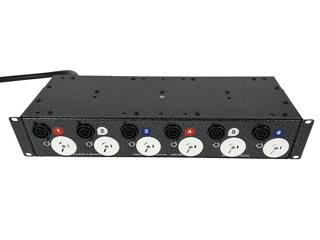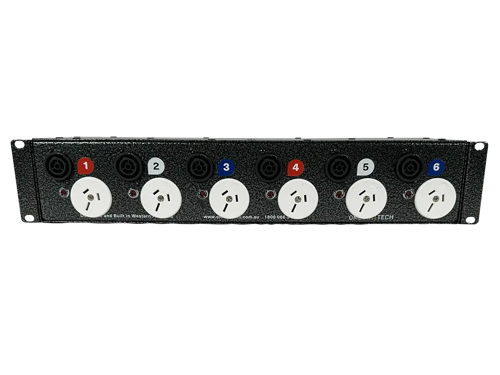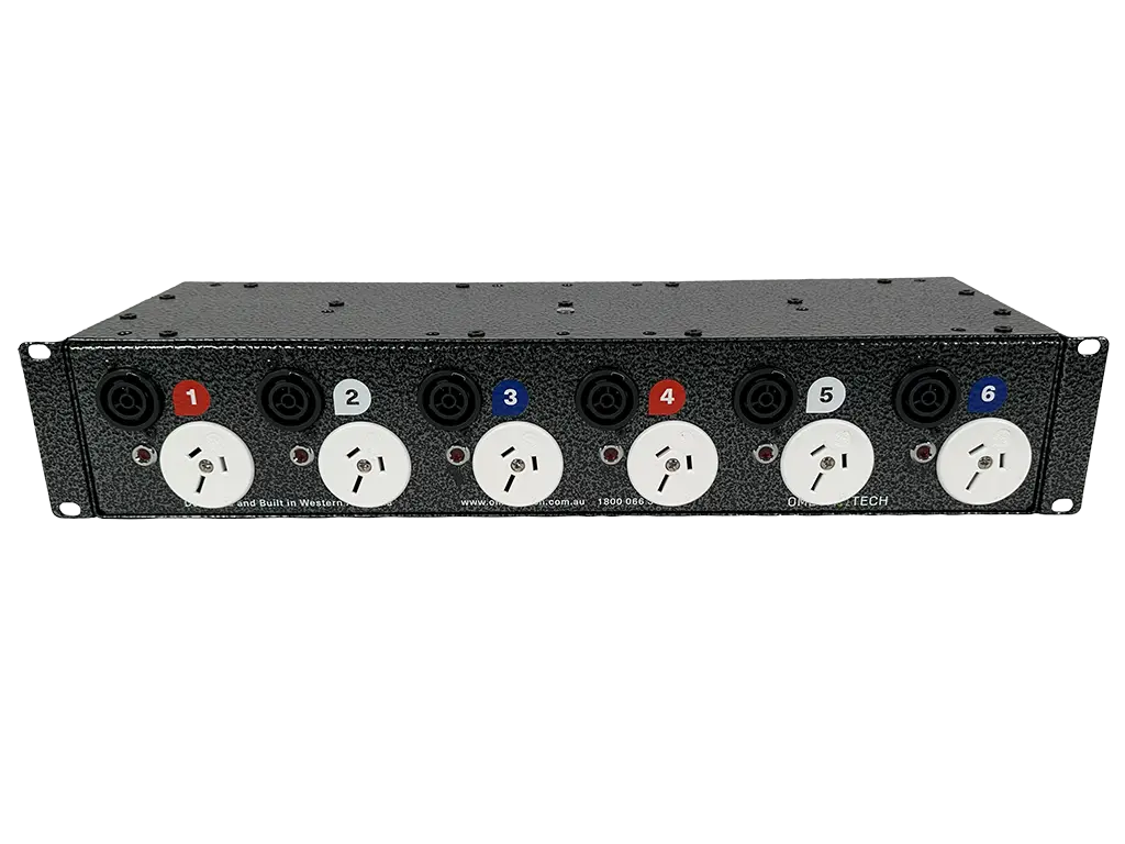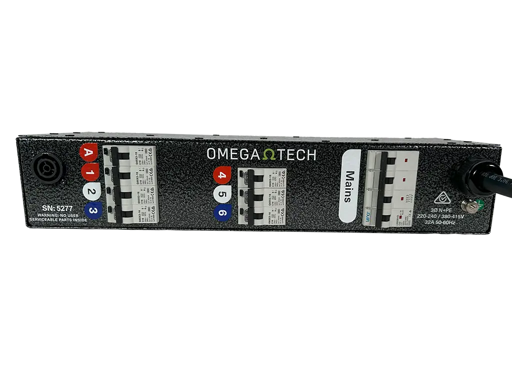 OmegaTech’s range of 6 channel Power Distribution Units (PDU6) is designed for fixed or mobile applications where three phase to single phase socket outlet power distribution is required. The range is built on a 2U 150mm deep 19″ chassis, featuring adjustable rack ears, allowing the units to be front or rear mounted. As well as offering a traditional power distribution in a low profile package, it also offers a unique solution for stage power applications when reverse mounted and paired with our Stage Box Strips. It is also ideally suited for use with data distribution or powered speaker applications where hybrid cables can be deployed to both signal and power without the need for extra patch bays.